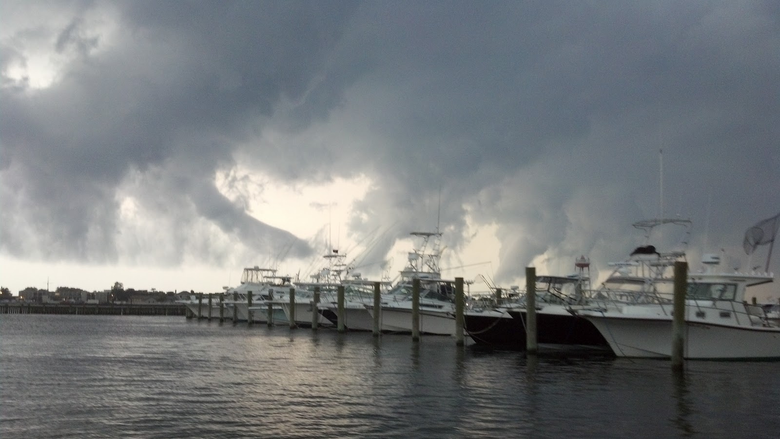 Our anchorage was on the ocean side of the Cape May Canal providing us with a good view of fishing boats coming and going each day, along with gathering storm clouds moving across the land towards sea. One night we took the dinghy ashore for dinner at an outdoor restaurants. The sky darkened considerably and the wind picked up a bit once we reached shore, but we felt confident that the storm would hold off long enough for a bite to eat. But, just as our food was served we looked over and saw this: